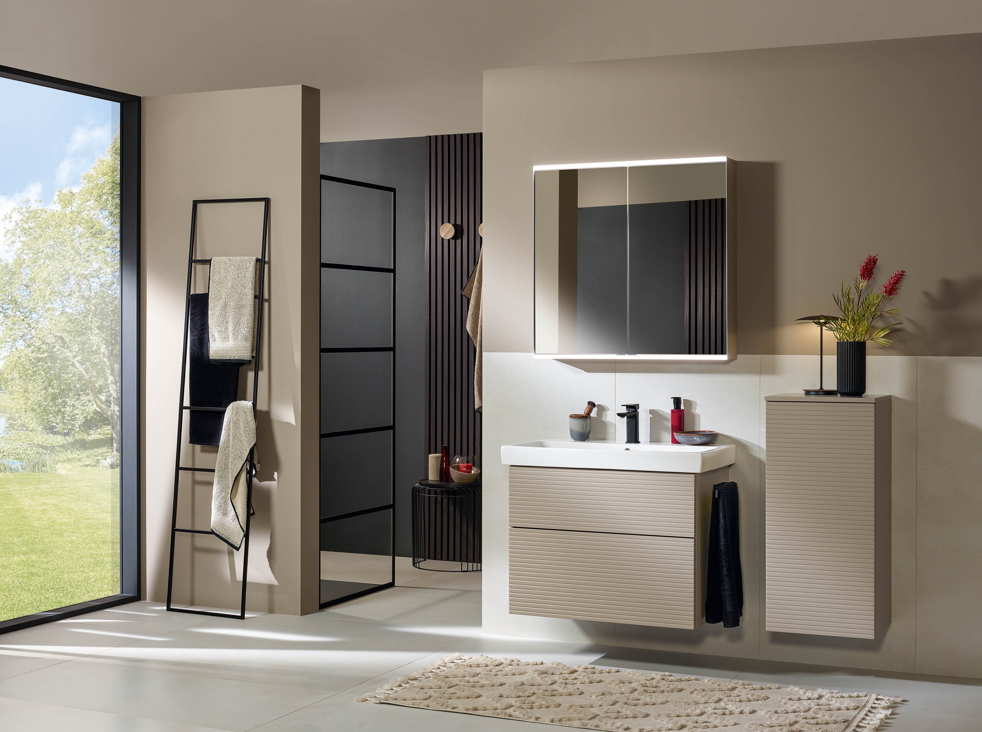 1. Entdecken Sie die neue 3way-Struktur von Sanipa: horizontale, strukturierte Fronten, Push-to-Open-Funktion und hochwertige Materialien für stilvolle Badmöbel.